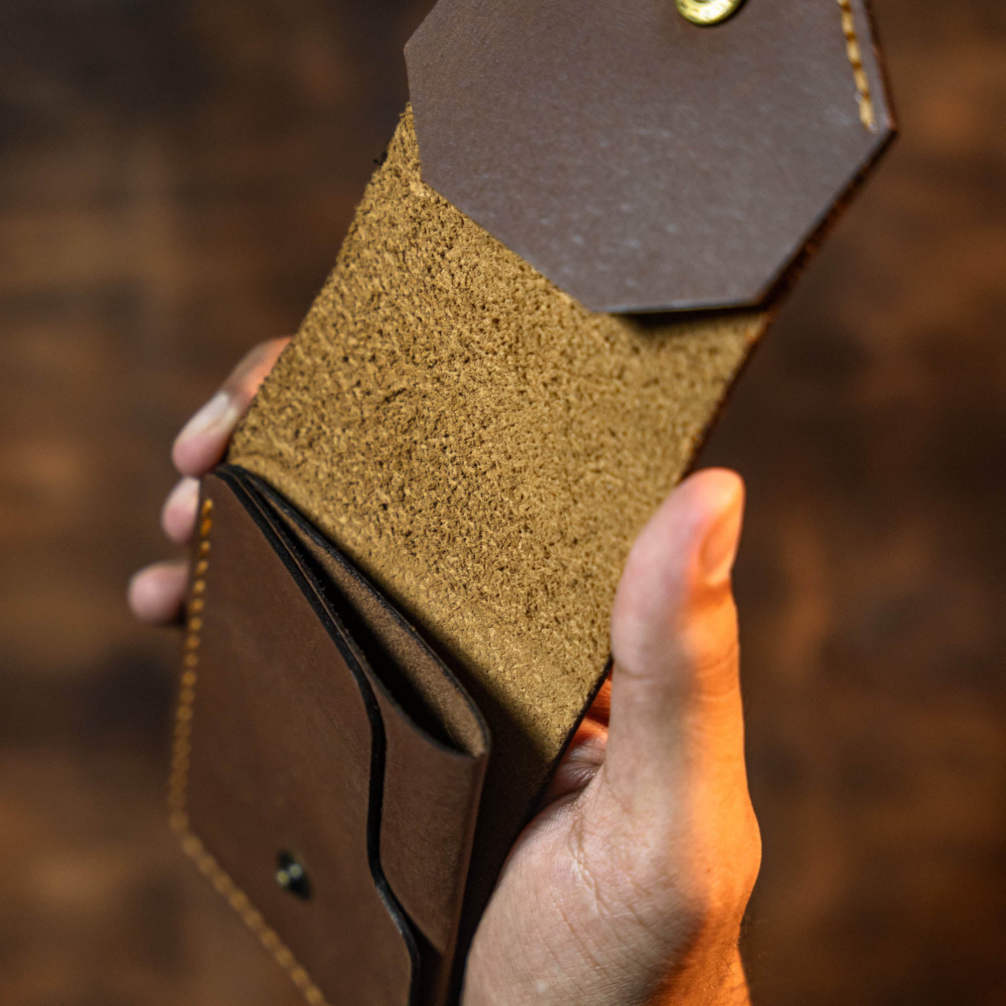 Carry your essentials with minimalist style. This handcrafted leather wallet features a slim profile perfect for front-pocket or bag storage. The secure button flap keeps your cards and cash protected while maintaining a sleek, compact design. Expertly crafted for everyday durability and timeless appeal.